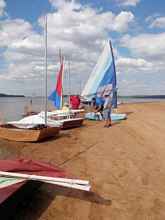 For a while the Rampant Goose did a fair job of keeping up with her more sophisticated sisters, but, as the wind eased up, we began to fall behind. My reefed lateen sail doesn't have a very efficient shape for upwind work. Shaking the reef out while underway looked like an opportunity for embarrassment, so we eased over to the nearest beach and unleashed 81 square feet of determined Dacron.