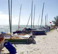 We got to Ft. Desoto on Thursday and made sure to get a good night's sleep. On Friday, we sailed Oaracle from the park's launching ramps to the starting beach so John could get a feel for the boat. Robert Terry from Bradenton, a future hopeful EC participant who would store my pickup and trailer for us during the race, also came along. It was John's (and Robert's) first time on Oaracle and the first time I had sailed to the start rather than taking the boat to the beach on a trailer. There were light winds at the ramp that freshened as we sailed along and provided an exhilarating broad reach by the end of the sail. We beached and with some help hauled the boat above the high water mark.