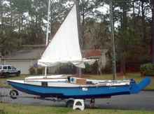 I didn’t take any pictures afloat showing the third reef tied in. so here’s one with Oaracle on the trailer a week before the start of the EC while testing out reefing lines. Because of the low aspect of the triple reefed sail, Oaracle won’t point well with it, but will close reach and do well on other points of sail. We needed that tiny triple reefed sail twice, fortunately never while close hauled.