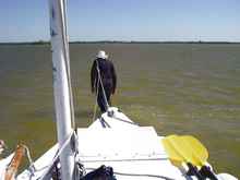 As Oaracle made the last turn, she slipped from the protection of the mangrove islands and a strong breeze hit us from dead ahead. For company, the wind brought a sharp chop. I was rowing, so had my back to the problem but felt the breeze and waves. In a matter of seconds, the GPS showed out speed going from 2.5 knots . . . to 0.5 knots . . . to 0 as the bow slapped in the chop. John beached on a shoal on the south side of the channel, so we could consider our options. On the way, one of the seat cushions abandoned ship and John offered to go wading and fetch it, but I didn't figure it was worth the effort. The boat was halted only a short ways from Channel Marker 26. This was a bit frustrating. There is a shoal just past 26 on the south side and just beyond that there is shallow but sailable water in the bay. We were maybe a football field away from freedom. John proposed towing Oaracle to the shoal, but I thought that might be too much in the winds, which were in the 25-30 range. We had maybe 200 feet to the north side of the channel and I thought maybe we could get enough momentum in that space to short-tack up the channel (or rather the shallows on either side of the channel) with a double- reefed main and eventually clear the shoal. John, of course, was right and when I wasn't looking, he slipped over the side, grabbed the anchor line tied at the bow and began slowly walking Oaracle upwind. Conceding defeat, I tied the second reef in the sail, hoping we wouldn't need the third.