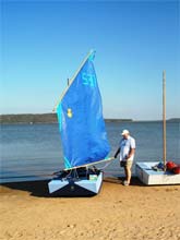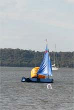 The third race 10 min warning went off about 3 minutes after I finished the second race. (I think they were all waiting for me to finish so they could get on with it...) I had taken my sail down because it was binding and I wanted to re-rig it and get some water. Steve Bosquette threw me a couple of bottles of water as I re-rigged and got off the beach at the 4 min warning. I was on my way to the start line when the race began. I didn't have any problems crossing the start like before and thought I was going to have a better race. I was wrong. Again whenever I went for the first buoy I always ended up in trouble around the sunken trees. I believe I was lapped by the entire field on the first go round. I made sure to watch how the other boats were oriented, the set of their sails, and tried to do the same. Eventually I finished my first lap. As I passed the start line again I think there were two or three boats just finishing up. Determined not to give up I pointed my bow towards that cursed first buoy and felt like I was finally getting it. About the time I hit the tree stumps and was going to come about I lost rudder control. Cursing, I found that the bottom eye had ripped out of my rudder head. I pulled my rudder out, and carefully disassembled it so as not to drop any crucial parts into the water then pulled the whole thing into the boat as my sail flapped in the wind. I repaired the rudder head, put everything back together and saw that I had been pushed way farther out than I wanted during my repairs. With a sigh I pulled in the sheet and started for the buoy as one of the chase boats came out and asked if I was all right and did I want a tow. I thanked them for the offer and declined. I was going to finish this race! And I did, and it felt great coming across the finish line.