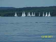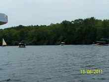 Un-hurried, but still too soon, it came time to get along. Steve and I shoved off and motored East, then North, up the mile long ¼ mile wide inlet to another ramp, set next to a lovely cedar picnic grove, with tables and fire grills. There were more steam-boats, kayaks and pleasure craft as we went along. And more still as we retraced our route down the inlet and acrross the East Basin, through the connecting passage, and on down the lake past the marina and race bouys - competition now completed. As forecast, a bit of cloud cover was building in, and the breeze had steadied up a bit. There were a good many sailboats reaching SW and NE ... Compacs, Precisions, etc. ... some keel boats. But just one tan bark sail - Jack, of course, 2/3 the way down the lake.