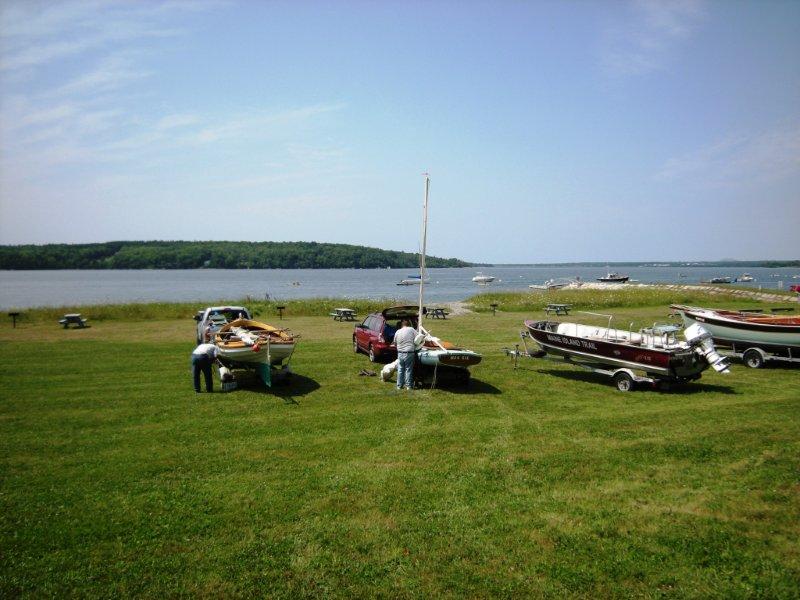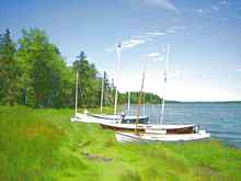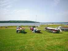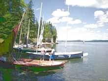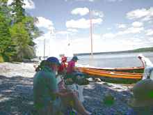 Saturday, the forecast was for modest winds, but as soon as we were in the water, the winds began to pick up. We sailed to Bean Island, had lunch and made plans to explore Young's Bay on the way back. However, the wind continued to build to 15+ knots and each Skipper decided to keep heading for Lamoine, with most under full sail. It was a spectacular run! What a way to end three days of sailing! Lobster dinner was awaiting us upon our return. After we arrived at Lamoine, most boats that came in were beached to await trailering. After about two hours, most of the boats that were not moored for the night had been pulled out of the water on their trailer and set in the trailer yard for pick-up. It was a marvelous choreography to watch and in which to participate (I took several turns cranking the winch). Afterwards, the lobsters were definitely calling us. |