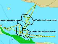 A little later I cranked the sheet in as far as I could to she how much would be squeezed out. The boat went noticeably slower thus pinched, but the tacks were 100 to 105 degrees. They look almost square on the GPS track.