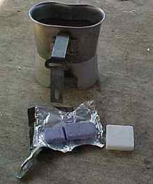 Available at Surplus Army Stores is a Canteen Cup stove that was the US Army's answer to the German Army Esbit stove. The canteen stove is designed to fit around the bottom of an army quart canteen cup. A Canteen Cup will sit on top of the stove. It uses solid Esbit type fuel tablets. The fuel tablets should be placed on foil or a scrap of aluminum to protect the boat's surface.