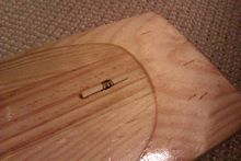 STOP. Don't glue together now like I did – remember to seal the inside surfaces of the sound chamber as getting a brush in there afterwards is nigh on  impossible. Then glue together (note the nail stopping things from sliding around). After gluing together finish off the shaping of the blade. The small hole is where the strings feed through to be tied to a short piece of a thick bamboo BBQ skewer. The strings will be held in alignment on the bridge by notches.