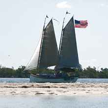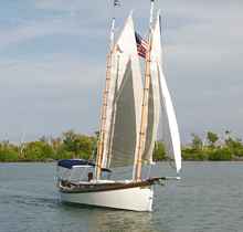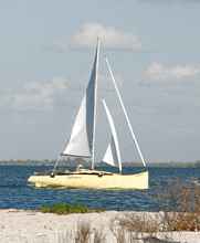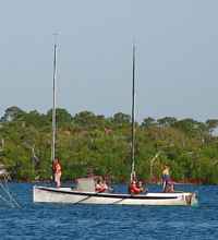 Dennis Bradley winters on the north end of Pine Island at Bokellia, and still sails around in his 28' Monroe sharpie, "Egret". The bowsprit and jib have done wonders for her performance, and she's usually the largest "beach" boat at any gathering. With her sweet sheer and traditional good looks, she draws a crowd wherever he goes.