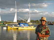 Here Dennis stands in front of an overpowering Sea Pearl tri. Twin engines seems a bit much for the easily driven Pearl, but there is something to be said for redundancy.