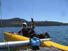 My usual summer visit to Minnesota, and it's week of sailing Adam's A cat on Lake Minnetonka, and a day or two with the Fleet 444 catsailors, gets transmuted into a glorious 9 days in Rollins with Kathy. Of which I snuck in 8 days of powered up sailing under gloriously sunny summer skies. With 4 cats scattered along the shoreline, if there's a breeze somewhere, it'll be exploited. It's my job! If I can't see pressure from the hill just above the cabin, I'll fire up the DRZ and climb a couple thousand feet to get a good view of the lake, north towards Lakeside, and south to Dayton and Big Arm bays. And what a vista! Flathead Lake is 28 miles long, north to south, and 15 miles wide from Elmo to Yellow Bay. Clear, deep blue water, with the rugged Mission and Swan ranges to the east, and rocky, coniferous shores, which often reminds me of Superior. A magnificent sailing playground for a fellow like me!
