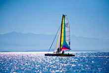 My regular perusal of catamaran classifieds turns up an 18 square ridiculously cheap in San Diego. A class racing boat from the 80's, it's 18 feet long, 11' wide, with a monster mast, 35' tall. Another light air machine. That lust that I seem so susceptible to, develops once again! I surely don't need another boat, but this is one I've eyed for years, and here was a great opportunity to see if it'd be as much fun as I had imagined. So I scan about for a partner. Not that hard to find. My regular crew and landsailing/iceboating guru, John, has been thinkin' that he might be needing a cat of his own so he doesn't have to drive that 10 minutes south to fly with me. He ponies up the purchase price, and I arrange and finance the craft's journey north. Yippeeee! A new toy! John hacks up a boat lift to adapt it to the wide beam, and she has a new home in Lakeside. I now have a ride there at mid lake, Flight Risk 10 miles further south at the cabin in Rollins, with High Voltage on Dayton Bay another 10 clicks to the south and west. Which is the bay with the magic wind!
