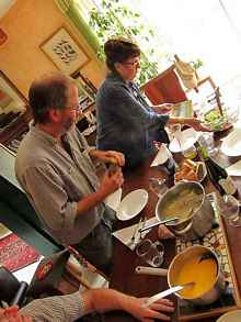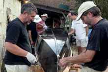 Over that first week, we fell into a rather regular routine. Wake with the sun, enjoy a light breakfast of café and croissant, often fetched from the local boulangerie (bakery) during my morning jog, then swing through the local grocery and/or hardware store for supplies and then back to Brian's house to commence building. At mid-day, we would break for lunch which consisted of meals home-cooked by Brian and his mother Beth. Culinary highlights included home-made pumpkin soup and a delicious rabbit/plum stew all of which were accompanied by generous portions of French cheese and crunchy baguettes. Mik began estimating our group's bread consumption in terms of meters, i. e. 4-5 meters of bread per day!