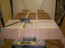 I glued the girders, frames, and bottom sheet with polyurethane glue, which hardens quicker than epoxy and can be used in cold temperatures. It forms froth, which has to be removed while it is still soft, but it speeded-up my construction by several days. Cleats were added along the joints to increase the gluing area.