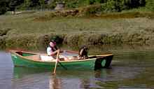The boat rows nicely, although I find it hard to steer straight when I face backwards. The plastic rowlocks are from Duckworks and the 8-foot oars are based on the plans in Gavin's book "Ultrasimple Boat Building". In shallow channels, I find that a paddle is better.