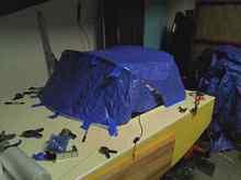 Back at the shop, it was time to turn my attention to making the dodger that would enclose the cockpit providing shelter both when sailing and sleeping. During one of the BEER cruises I did a bit of dumpster diving picking up a dodger and frame that was taken off a large boat. This provided nice aluminum tubing to use in building the dodger. I bent it into a two-bow frame and used some bimini hardware I had around the shop. Once again, I turned to duckworksbbs.com and got snap on/off bimini side mounts which I had used to great effect on my catboat "Little Gem." I used these and some masking tape to prop the frame on the boat.
