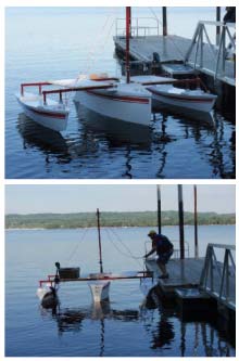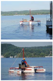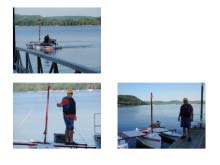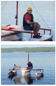 The circular wake track in the top picture shows the boat turns pretty effortlessly and tracks well through the turn. Lower left shows my standing with all my weight over the center of the port outrigger. The boat is firm underfoot, further showing the side to side stability.