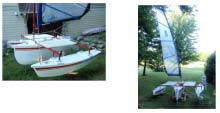 Irascible was conceived as a prototype to test out some design and construction ideas before committing to designing and building a larger version. The dinghy is 8 feet long, ten feet wide, and weighs about 200 pounds. The initial windsurfing rig provides 6.5 sq. meters of sail area.