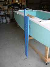 After installing a plywood bow panel, along with a splashboard and some hardware mounting blocks, I painted the upper hull using latex primer, and deck and floor paint. Some builders buy gudgeon and pintle sets to attach the rudder to their boat hulls. Many other builders use less expensive methods. I used eyebolts for gudgeons, and a brass tube for the gudgeon pin. I made the rudderstock from ¾-inch plywood and the rudder blade from ½-inch plywood. The tiller was made from an old post-hole digger handle! (After several months of use, I decided that I could now afford to buy by a "store bought" gudgeon and pintle set, so I ordered a one-piece gudgeon and pintles set from Duckworks. 358-BRG.