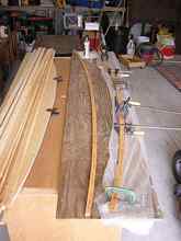 To make the chine laminations, I built a simple jig by driving nails into a piece of ¾" plywood, along the line where I had marked the bottom of the hull. I coated the inter surfaces of two ½" x ¾" strips with Titebond glue. Spring clamps were used to hold the wood strips to the nails while the glue cured. You can see the nails driven along the hull's marked outline at the top right of the photo. It took several days to laminate the four chine logs, since I had to let each strip cure for several hours before removing it from the jig.