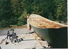 For my first attempt at building a larger boat, I decided to reduce all the dimensions by 10%. At that time I did not feel comfortable trailering a boat that was 8 ft wide (the maximum at that time). Since Glen-L provides full sized patterns for all the ribs, stem and transom, it was relatively easy to reduce the dimensions by 10%. The hardest part was adjusting for the fact that the standard lumber sizes would not be reduced as well. I have only a few photos of this first boat since I did not have a digital camera at that time. The photos I am including are scans of regular prints. When I start writing about boats #2 and #3 I will have many more pictures.