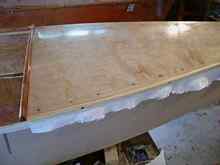 With those items settled, the same plywood technique made it pretty easy to make and install the deck plywood (paper pattern rough cut leaving the edges hanging over to be shaped and covered later by rubrail and cockpit sides).