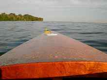 The second morning I launched the kayak (the "trailer" worked beautifully, getting it down a rocky beach for a solo launch, and retrieval). The trailer is shown in Figure 37, but I'll describe it here: ¼" threaded steel rod, with copper sleeve between the eyes, two more sleeves that go under lawnmower wheels, with PVC spacers to keep the wheels from rubbing on the rubrail Paddling out onto Lake Ontario was a wonderful experience. Deb and I paddled it together (two paddles by now), and had a great time, though we were stopped by the U. S. coastguard, and had to return to shore for proper life jackets (in Canada, my boat didn't need registration, which I didn't yet have, but the cushion flotation didn't pass muster for Canadian rules, and so we failed to comply either way with the Bureau of Compliance). I had rigged a tiller locking mechanism, two thin cords routed through screw eyes under the cockpit sides, with a loop over the tiller. I've tweaked it since, but with the rudder partially down and locked, the boat tracked beautifully. Here's a shot down the daggerboard trunk with nothing but deep clear water underneath!