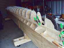At this point in the process it was time to start tackling the forms. Skip provided me with drawings of all the stations, and I also asked for a cad file. My daily life is CNC machining and I thought about machining all the forms, but opted to use the bandsaw and sander to make them. Everything was drawn out on the plywood and I began the process of making my stack of forms that would turn my 2d project into a 3d reality. Once installed on the strongback, a beautiful skeleton emerges.