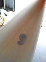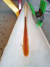 When sanding the outside of the hull to get everything faired out correctly, I got a little thin on both the bow and stern about 1-2 feet from the ends. To help with this I did two separate pours of epoxy and wood flour.