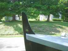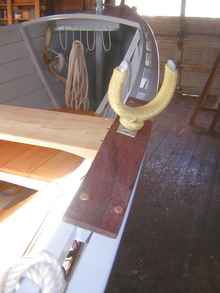 The steering oar has a custom bracket based on the museum drawings that bolts to the back deck. The cut out shown on the horizontal surface gives a more fair bearing for the oar shaft. The two contact surfaces and the restraining lanyard were also covered with leather.