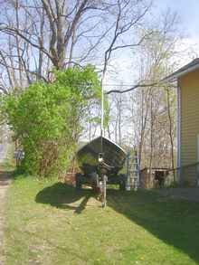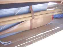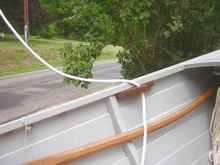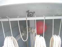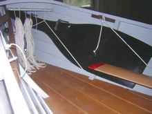 The sails live in "horse blanket" covers when not in use and all the gear (pfd's, tool bag, jib, etc) live in a large duffel that fits under thwart 2. Photo below shows the line hangers (fore and aft) for stowing dock lines, etc.