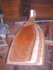 While waiting for the sails to be finished, I went on to build the rudder. This consisted of two pieces of 1/2" ply glued together with 3/8 oak cheeks on the sides, to fit the gudgeons and pintles from Classic Marine. The rudder was faired, especially at the trailing edge; the photo of the ply layers shows this well.