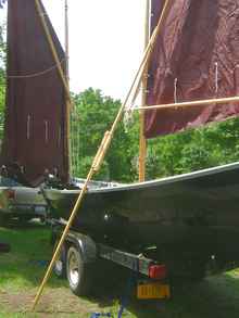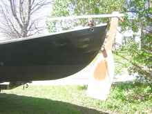 This boom is stowed, along with two oars and the boat hook, on leather slings on the side of the centerboard case.