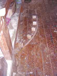 Photo below shows the second mainmast mast step; note the drainage hole in the bottom of the socket and the rivet aft to keep the hole from splitting out. This step fits between two floor frames to prevent fore and aft movement.