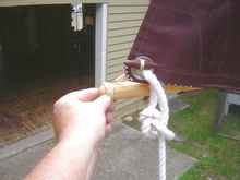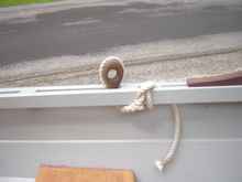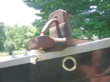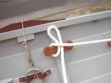 The loose end of the knotted cord fits into a counter sunk hole; I forget where I first saw this done but it is a handy item. The Celtic dragon is an old iron window sash latch from my house; every boat needs a talisman.