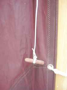 Both the boom and the sprit snotters hang from the same thumb cleat .The mizzen is nearly identical to the Catspaw sail, except for the boom, which was required in this case since the sail could not be sheeted properly without it. The single sheet is transferred back and forth to open jarrah cleats just like the Catspaw and hitched for control to the the "bone" cleats. All these lines need to be left free to run, and a slippery hitch is the belay of choice.