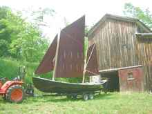 It has two sheets which lead port and starboard through the lizards and tie off with a figure of 8. The main is fairly complicated as sprit sails go, having not only the snotter, but a sprit halyard and peak outhaul to allow reefing without lowering the sprit (see Keuka whaler #5). The sail is fastened to the mast with toggles. The brailing line hangs at shoulder height with a small T toggle to grab.