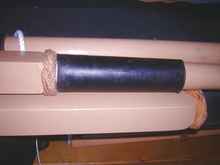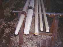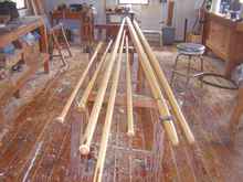 The photo above shows the spars in various stages of round: from left to right, mizzen mast, main mast, main sprit, mizz sprit, mizz boom. The next photo shows them sealed with the oil/pine tar mix, with sheave on the main sprit, masthead collar etc.
