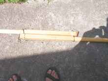 The two pieces on the left fit together and elongate through the brass rings (like a stunsail boom) for the mainsail when running downwind. The brass rings are seized into turks heads, and a free end of line holds a peg; when the rings jam on the square loom, the pegs are inserted to hold it fully extended.