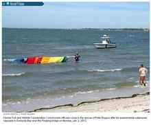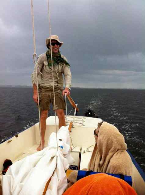 Peter the Plumber use to be a normal kind of sailor guy (except he likes high performance boats) till he happened across a little half finished boat. With very little encouragement from me he worked on it and then another and so on. Now see where it's gotten him, ship wreaked out in Sarasota Bay when his newest creation self destructed in high winds. He took a 20ft Shark cat hull and a 16ft Nacra cat hull, added some pipes to connect them like a Polynesian outrigger thingy and stuck on a giant sail, what could go wrong? Pete wasn't really rescued, he's a giant of a man who could probably swim the Atlantic Ocean. He was paddling to shore when the Marine Patrol showed up to give him a tow the rest of the way in.