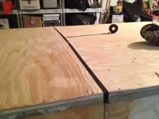 Your epoxy worked perfectly - thanks for a good product. My Kokeemo is progressing nicely for someone who is not using any blueprints - none. I finished the bottom, chimes and corners last week. We had two weeks of 80 degree weather in SW Florida- I guess that was perfect for a slowpoke like me to do his first epoxy/fiberglass layup. I have used 2 sheets of 1/4" plywood and three sheets of 1/2" plywood. I will need to buy only one more sheet of plywood to finish. The hull is hard to explain - 2 -29" x 96" pieces long ways with a keelson board down the middle to join it, and a 30" wide piece crossways at the cockpit end. I have a three way joint right at the rear cabin wall. I have a slight vee bottom 3/4" from center to sides and it tapers to a flat bottom at the rear of the cockpit. I don't know If anyone has ever done this before. A flat sheet of material has less strength than one that is bent or angled. This should eliminate a lot of bottom flexing - I still have to epoxy some bottom runners on later. Here are the update pictures. I am using some black tape to better show the joints on the plywood.