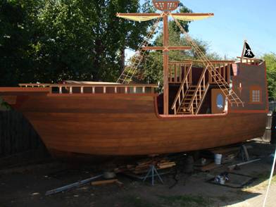 I would like to find someone or a group of people who would be interested in helping me complete the main deck, railings, and windows etc. and when the ship is completed, get a percentage of the sale of the ship. (for example - Completed Pirate ship asking price = $25,000.00 - Your profit share would be $5,000 - $6,000 or more?) (the actual value of the Pirate Ship Playhouse could be more!) need to have it appraised when finished.