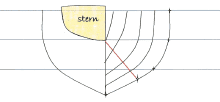 The exact shape of the stem is taken by measuring from the perpendicular to the stem on the waterline. I've shown one waterline to keep this drawing clear, but you should take at least 3 measurements. When you draw in the stem thickness-shown by the blue line-I'd just get a 1x4" pine and make that the stem thickness. If you work from plans, the stem thickness will be in the table of offsets, or it will be drawn in on the hb plan, as I have here.