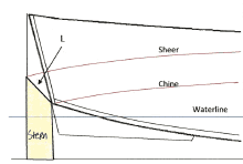 Going from profile to hb view gives us the widths of the stern at the chine and sheer and the angle in which the stern will hang but it does not give us the length of the sides, since the hb view is below the stern not facing it. So we need to do something else to get the length (L).