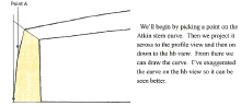 Now we'll finish up this short run through lofting a simple skiff by showing how the slight arc of the Atkin stern top is created. It amounts to drawing lines from the plan view to the profile view and down to the hb view.