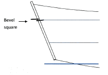 With the bevel where the bottom meets the stern transom, you can put a bevel square on the plans, use a protractor or even a folded piece of paper. If you use a protractor, only get the angle off the 90 degree line. A bevel is an angle off of square. This tells you where to set a table saw. The standard practice is to mark the number of degrees either as 25-degrees-U (for under when you're cutting back on the wood) or 25-degrees-S (for standing when you're cutting out) from where you mark the measurement line.