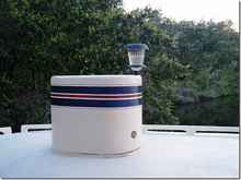 This one I will take credit for because I've never seen anything about this from any of the rest of you. It's probably the most brilliant idea to come along in years, maybe ever. Everyone knows that running lights are a pain in the butt. The front red and green ones sometimes work but the white one never does. For our size boats it has to be higher and behind the front ones and visible through 360 degrees. We end up with a light on a stick that goes in a hole with power that never works or one with batteries. Well, check this out. A solar power yard light. I looked around and found one that was extra bright and stays lit for 13 hours.