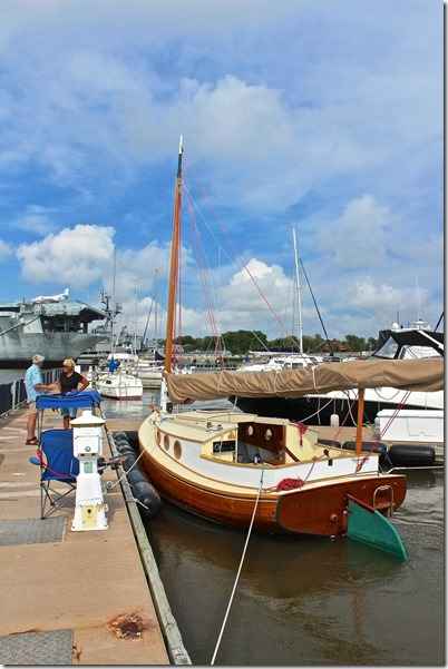 Judy Blue Eyes from Charleston bought Sweet Pea from Howard and is making it her own. She's sanding and varnishing the bright work, had the wheel replaced with a tiller and a lot of other things. She's going to end up with the prettiest boat in the marina that's full of big expensive plastic power boats. Sweet Pea is a Fenwick Williams 18 catboat that Howard modified a little by raising the cabin six inches so it would have sitting headroom. Judy got a perfect spot to keep her, right in a corner with fenders on both sides so she can crash in when the strong current is running. Look closely at what's way up in front of her, it's an aircraft carrier.