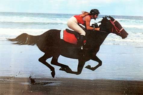 Kiwi Tina Turner, not the singer silly fellas, but Tina who does the engraving at Apex Trophies in Auckland, taken some years ago on her horse Bella, all four feet off the ground at full whack on a West Coast beach.