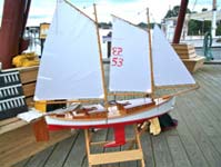 Additional to the sharpie building project, sometime ago a kindly gentleman offered David an antique (approx 1937 vintage) 6 metre pond yacht in need of a total rebuild on which he spent just short of 200 hours rebuilding. Seen above (left) in its restored state
