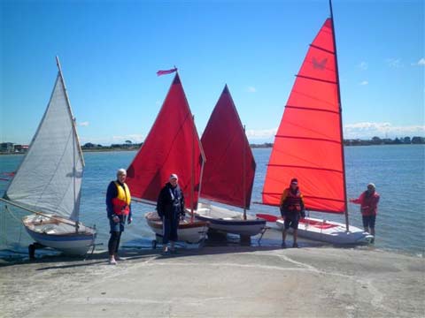 Left to right, Ian Kingston, Peter Braithwaite, Hugh Hobden with their Joel White Shellback dinghies, and Wes Purvis (New Zealand Moth). Photograph of the intrepid old bugger boy racers from the Christchurch Model Yacht Club taken at the Mt Pleasant Yacht Club on the estuary.