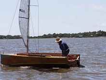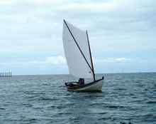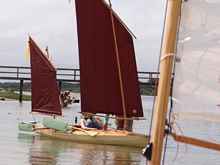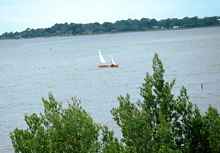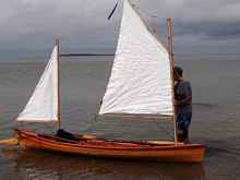 I'll comment on a few; the first is Chuck the Duck from Duckworks magazine in a fine new hat, the second is a new home built he's doing for next years meet. I've included a few more of Steve's tiny ketch rigged Wee Lassie. He's actually out in the ocean with the rest of us "big" boys in this eleven foot long, twenty pound open canoe and loves it and does just fine. My favorite may be the one of Judy's "Freedom" with it's perfect sail, Stan and Gayle in his double kayak and me and Helen in "Helen Marie"; looks like we're all out in the middle of someplace floating in the air. Notice that Jay's custom race boat is behind Steve. Pete the Plumber found the shallows in his space ship looking tri. This gathering really is as fun as I always make it sound. You just show up and do whatever you want to do. The whole dam place is only about a mile wide. Any of these hundreds of guys will drop whatever they're doing to help out or answer questions. The only organization is the great meal you can get from the Trailer Sailors on Saturday evening if you can wrestle a ticket away from Ron.